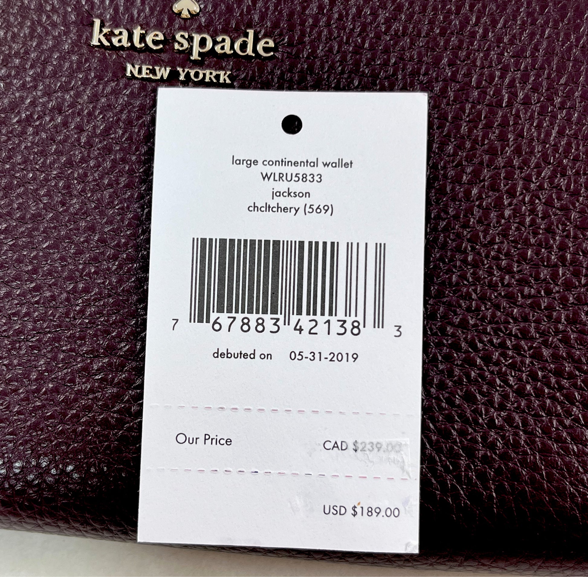 New Authentic Kate Spade WLRU5833 Jackson Large Continental Wallet Chocolate Cherry
